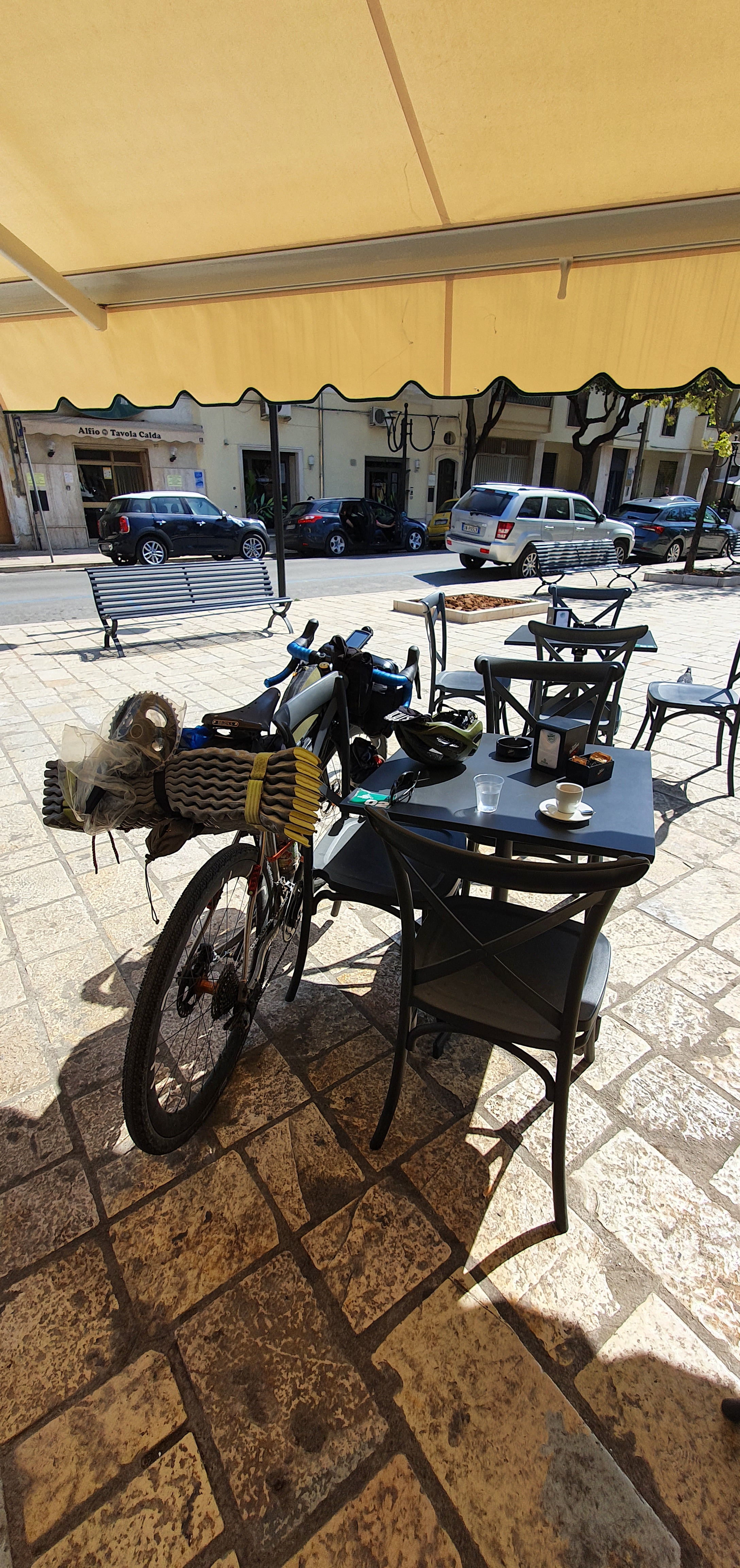 I got lost getting out of Brindisi and wasted maybe half sn hour riding in circles, partly my fault and partly Garmins. But eventually I got riding. Three route was flat. I was on the service road next to the motorway most of the way. This is part of the Appia Way built by the Romans to shunt troops about, it stretches from Rome to Brindisi.