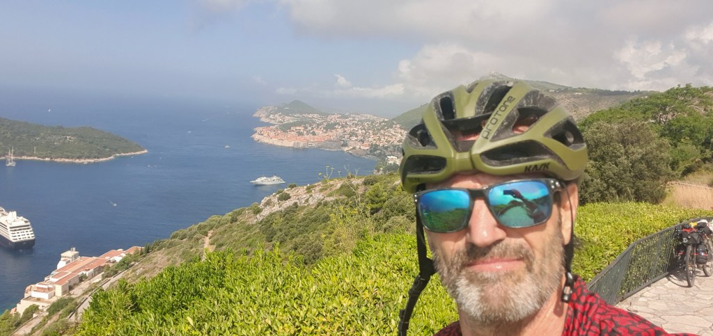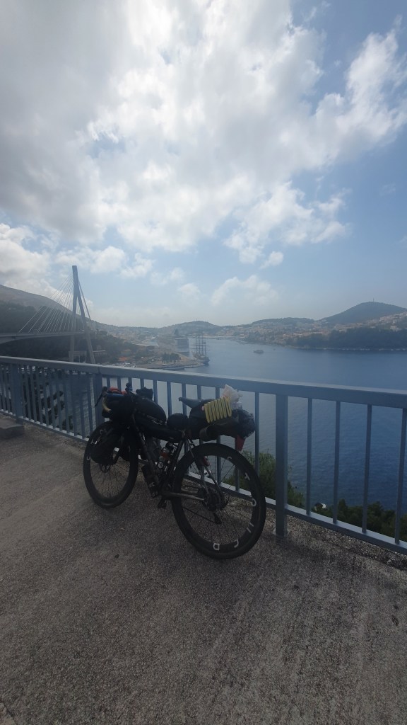 I started seeing cars queuing and anticipated the Montenegro/Croatia border was coming up. But I pedalled on.. and on…. and on…and on. I did stop and asked a guy in in UK numberplate car how long he had waited. 3 hours already. Finally up a steep hill, the border loomed. I sped in front of the 1st car and was through In no time. 10kms of queuing. That’s a long wait.