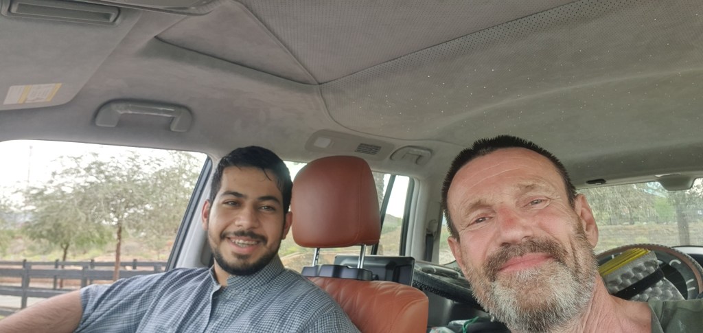 I was feeling good and the kms were clicking down fast. Throughout the day there had been overcast skys and drops of rain. Then it started to pelt down. An Emeratie guy stopped his car snd offered me a lift. He was such a nice guy speaking good English. Of course i accepted. We popped into his family farm. Then he took me to Hatta and my campsites.