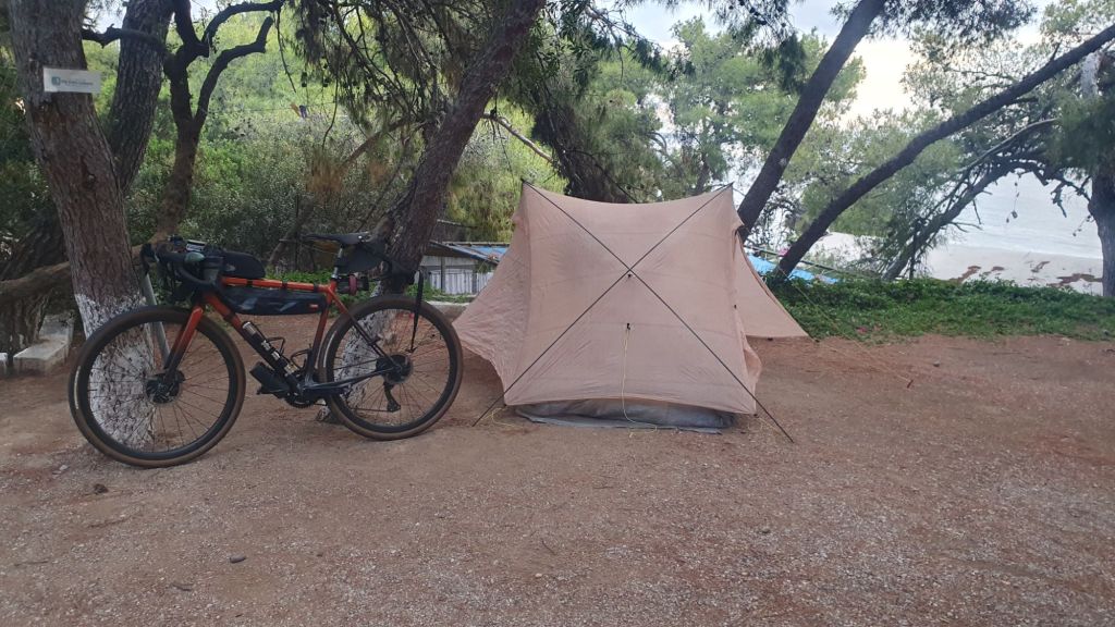 I have sort of got into the habit of stopping quite early. I like getting my tent set up washing my cycling clothes and knowing they’ll be dry in the morning. I have stayed at https://www.akrata-beach-camping.gr/index.php/en/home before and so when I saw it come up on the map I went in like a rat up a drainpipe.