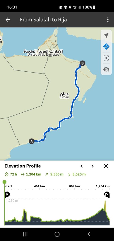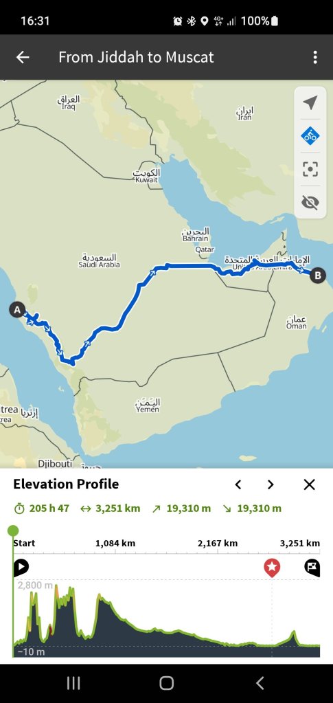 It will come as little surprise to you that I am often drawn to the Middle East. My plan is to fly to Jeddah on the west, Red Sea coast, of Saudi Arabia, Saudi has only recently in the last few years opened its doors to tourists. Cycle around Mecca inland a bit to Taif high in the mountains around 2000 to 2500 meters up, I’ll see how cold it gets, it snows there, I might have to get to the sea. Then follow the mountain range to Abha and Khamis Mushayt in the South west corner. East across the Rub al Khali to just south of Riyadh, across and into the UAE then on to Muscat in Oman, this route is just over 3000 kms. I hope then to take a bus from Muscat to Salalah at the southern most tip of Oman and return cycling along the coast road back to Muscat (another 1200kms) and home. This last bit depends on time available. You may also know that I have been to Oman a couple of times before and it’s safe and easy for me to be there.