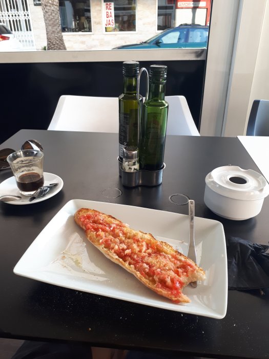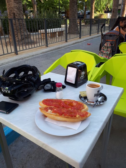 Straight to the nearest town (opposit direction from Alicante) bought new valves, just in case. Pumped tires to 40psi. Put on the front disc rotor, yes I rode from the airport without a front brake.