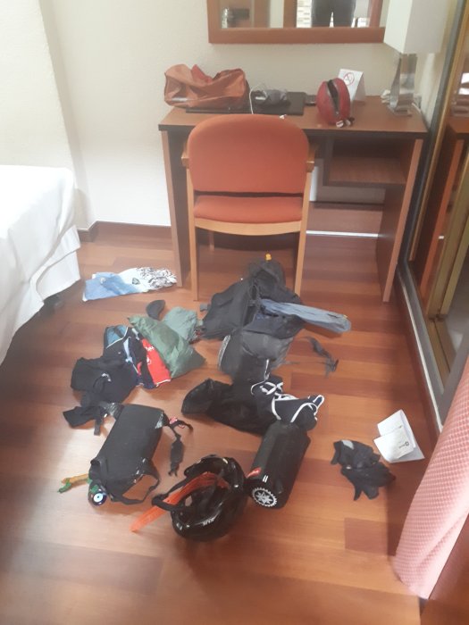 Classic cycle tourist room, washed clothes and best use of the floordrobe.