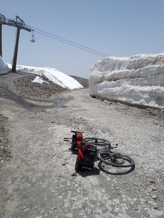 I thought there would only be a few snow drifts but they carried on… 100m long and so steep I had to lean hard in to stop tumbling down. I saw no other cyclists or traces of their wheels in the snow.