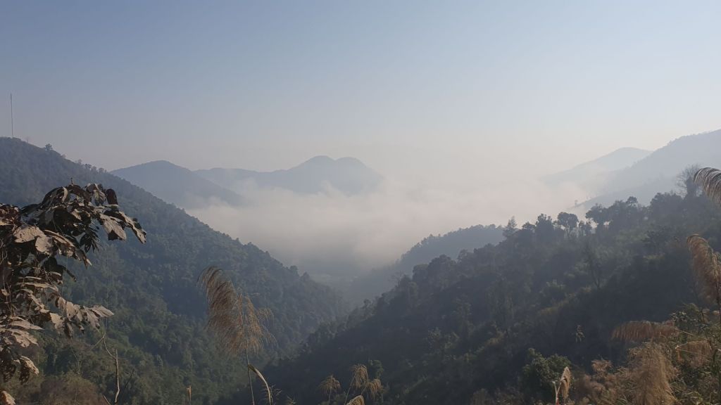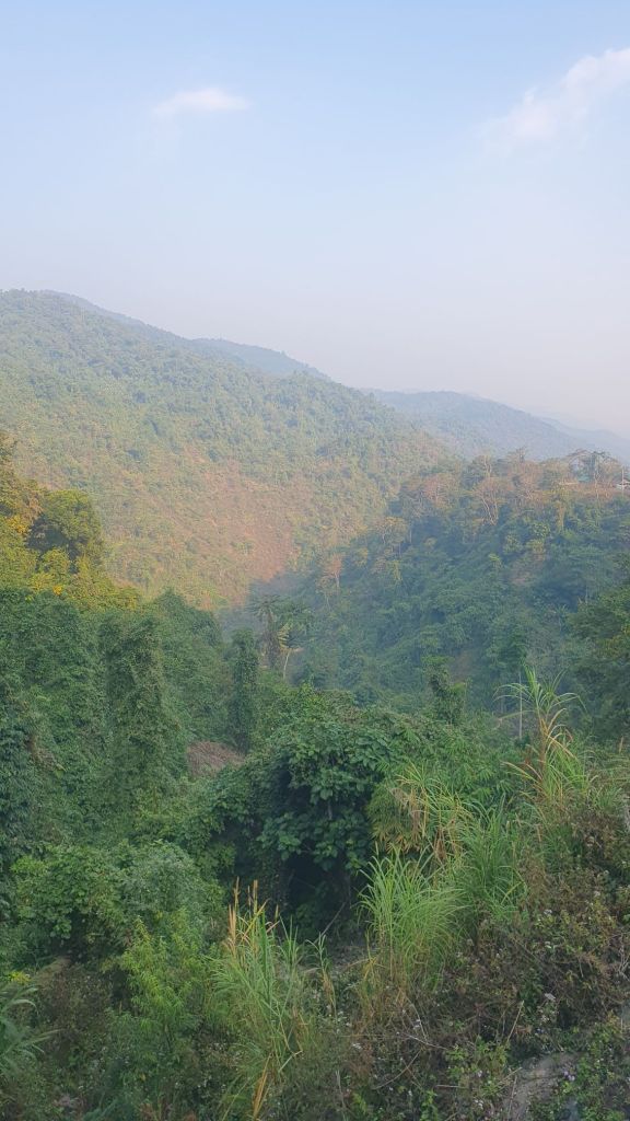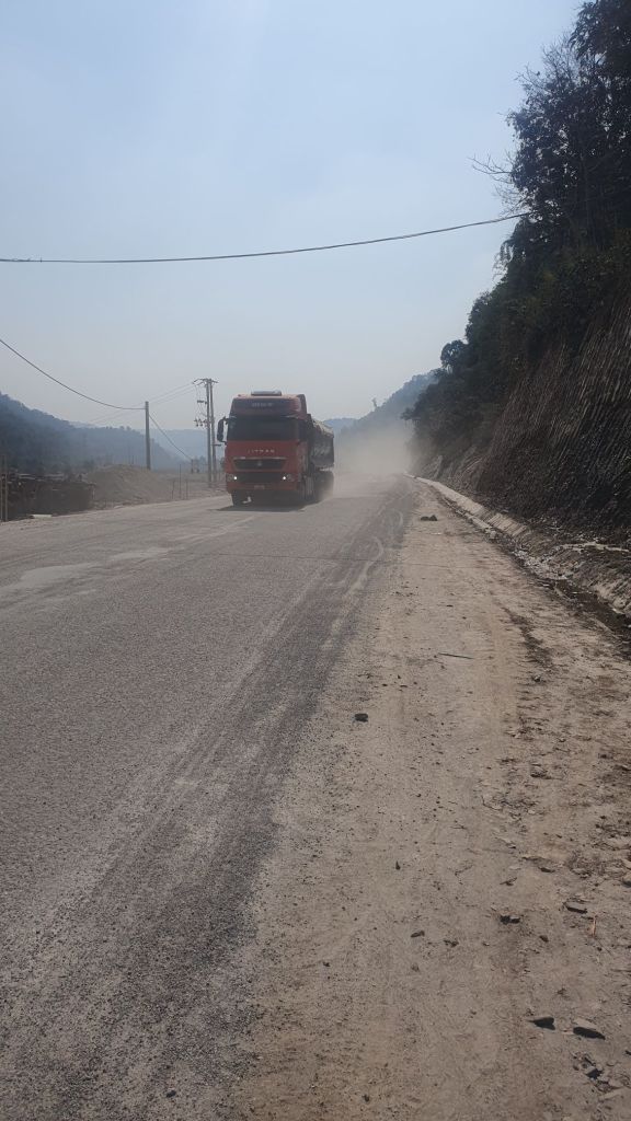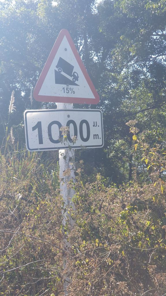 Then off I set. The mist was heavy so I flicked my lights on. Flat for the first 20kms or so then the road starts to pitch skywards and rise it did up to 1200meters. This border crossing could not have been more aptly placed. As the road rises it changes from tarmac to concrete, and beat up concrete, lorries going up snd down crushing the road to a pulp, kicking up plumes of dust covering everything. The beautiful verdant vegetation all changed to a gray colour. I was pushed off the road regularly. Eventually after a good 10 kms going up the lorries turn off and the last 2 kms are bliss.