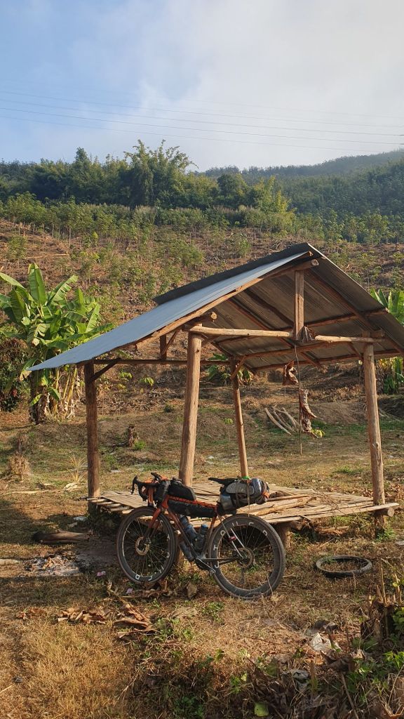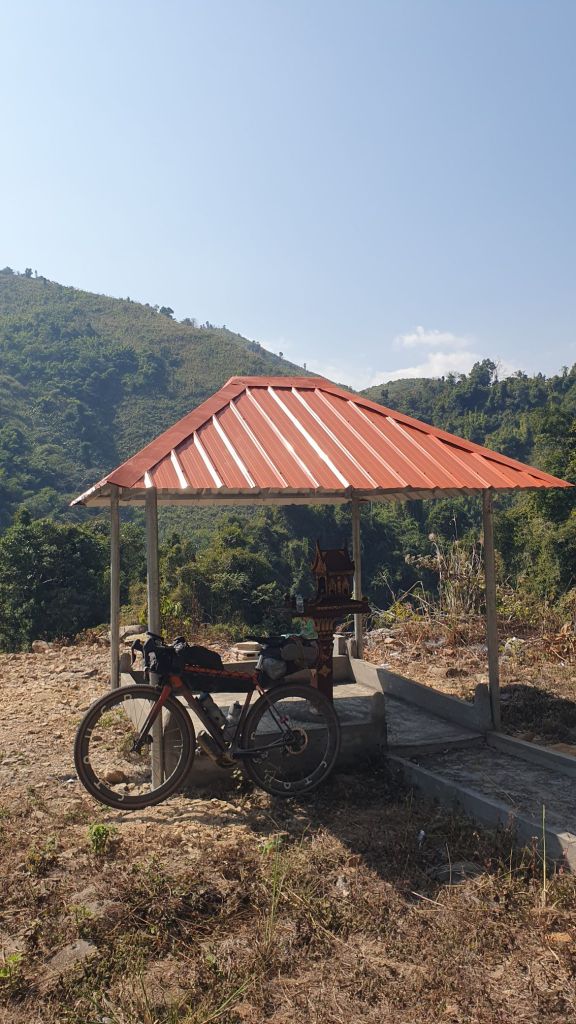 After a bit I was reduced to walking up each climb, I hung my head in shame as the motorbikes went past. And I nearly cried when Martje from Italy stopped for a chat. She had ridden from South to North in Thailand. We warned each other of the road elevation ahead, she rode on to find a camp spot. My legs were so wobbly I could hardly move. My heels were rubbing to blisters. And it was so hot, very little shade, i drank all my water. This route has had limited drink supply shops. Luckily I passed through a small village, I devoured 2 orange Fantas and decanted a bottle of water into my bottles.